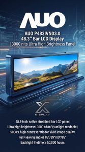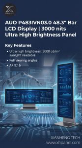 AUO P483IVN03.0 — это 48.3-дюймовый барный (stretch) ЖК-дисплей с ультра-высокой яркостью 3000 cd/m², высоким контрастом 5000:1 и широким диапазоном рабочих температур, предназначенный для наружных и промышленных решений.